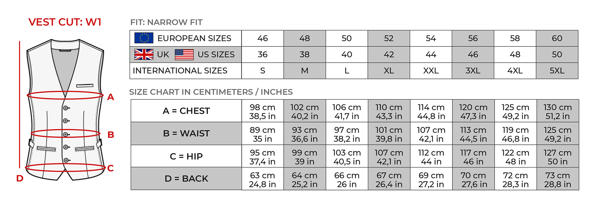 | Size | 46/90/S, 48/94/M, 50/98/L, 52/102/XL, 54/106/XXL, 56/110/3XL, 58/114/4XL, 60/118/5XL |