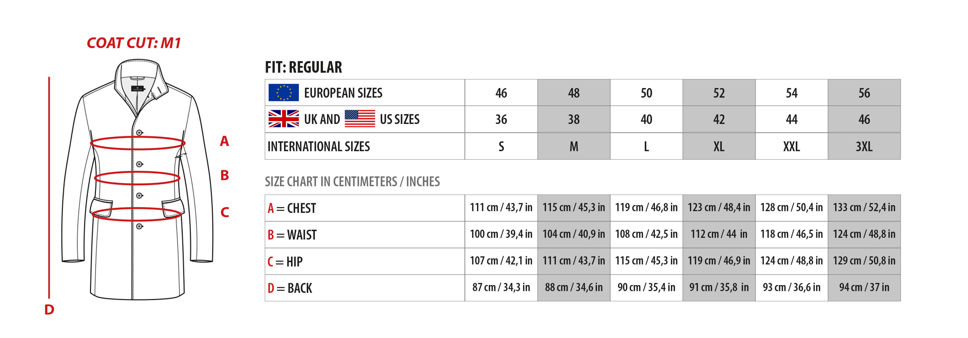 Using our SIZE CHART, you can compare your body measurements with our coat measurements. Please note that the listed values refer to the coat measurements and should be slightly larger than your own. Our coats are designed to provide ideal comfort and freedom of movement without compromising elegance. This way, you can be sure that your coat will fit perfectly.
