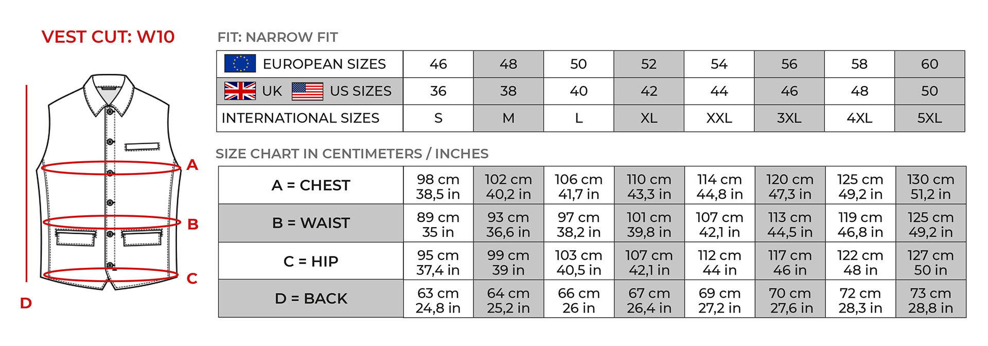 | Size | 46/90/S, 48/94/M, 50/98/L, 52/102/XL, 54/106/XXL, 56/110/3XL, 58/114/4XL, 60/118/5XL |