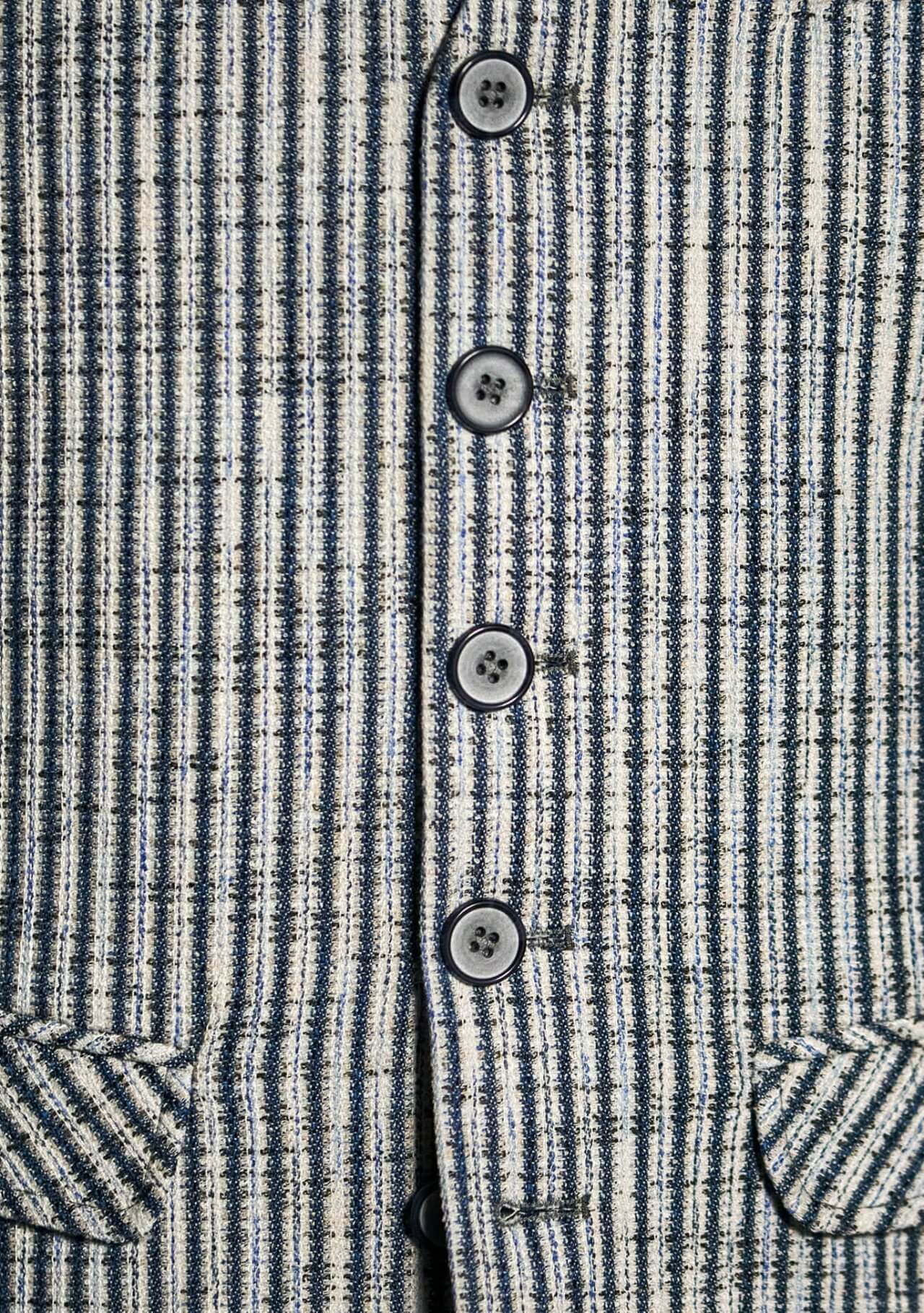The light color palette and woven stripe pattern make this men’s vest an ideal companion for fresh summer looks. It feels especially well balanced with white or light blue shirts in cotton or linen. Lightweight T-shirts or long-sleeve tops in white, ecru, or light blue work just as well. Chinos, summer trousers, or well-kept jeans in lighter washes pair beautifully with it, as do pants in sand or dark blue. For a relaxed outfit, style the vest with an open shirt and sneakers; for a slightly more polished look, pair it with a finer shirt, loafers, or lightweight leather shoes. This is where the style shows its fresh and distinctly summer-ready side.