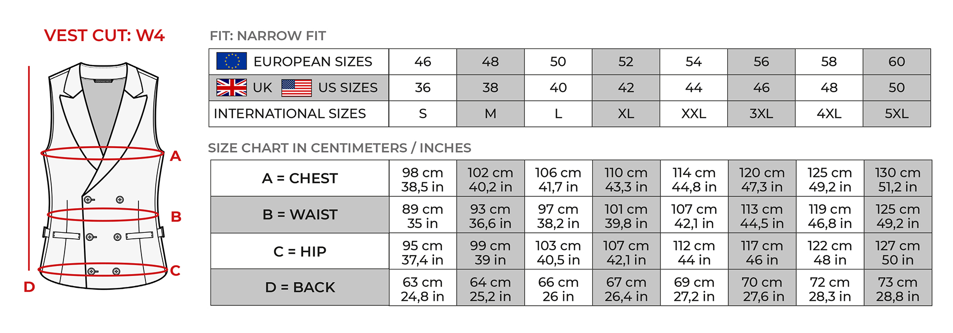 | Size | 46/90/S, 48/94/M, 50/98/L, 52/102/XL, 54/106/XXL, 56/110/3XL, 58/114/4XL, 60/118/5XL |