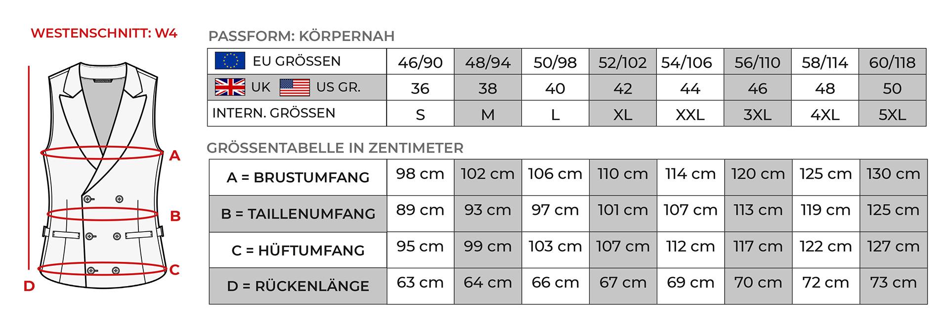 | Größe | 46/90/S, 48/94/M, 50/98/L, 52/102/XL, 54/106/XXL, 56/110/3XL, 58/114/4XL, 60/118/5XL |