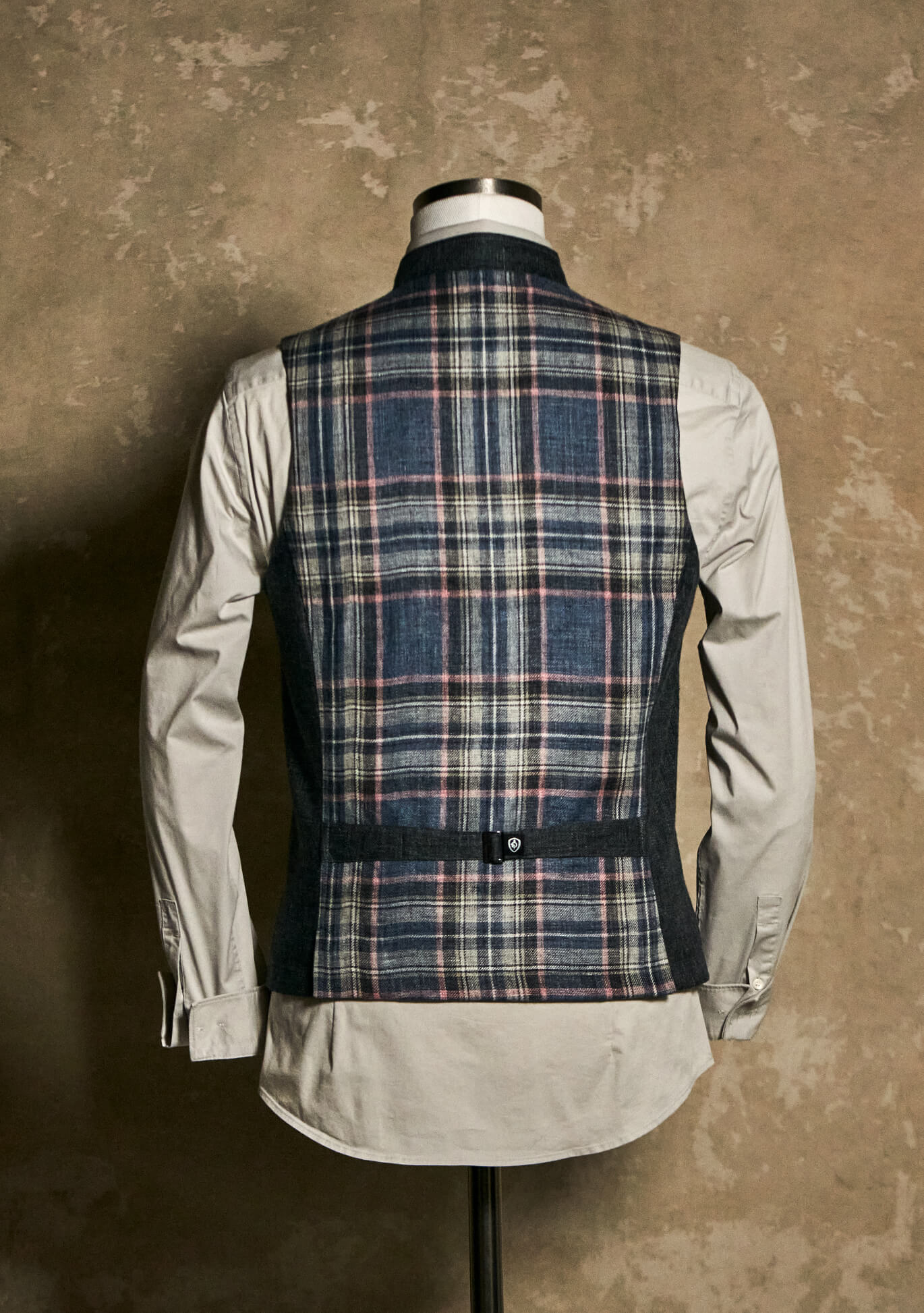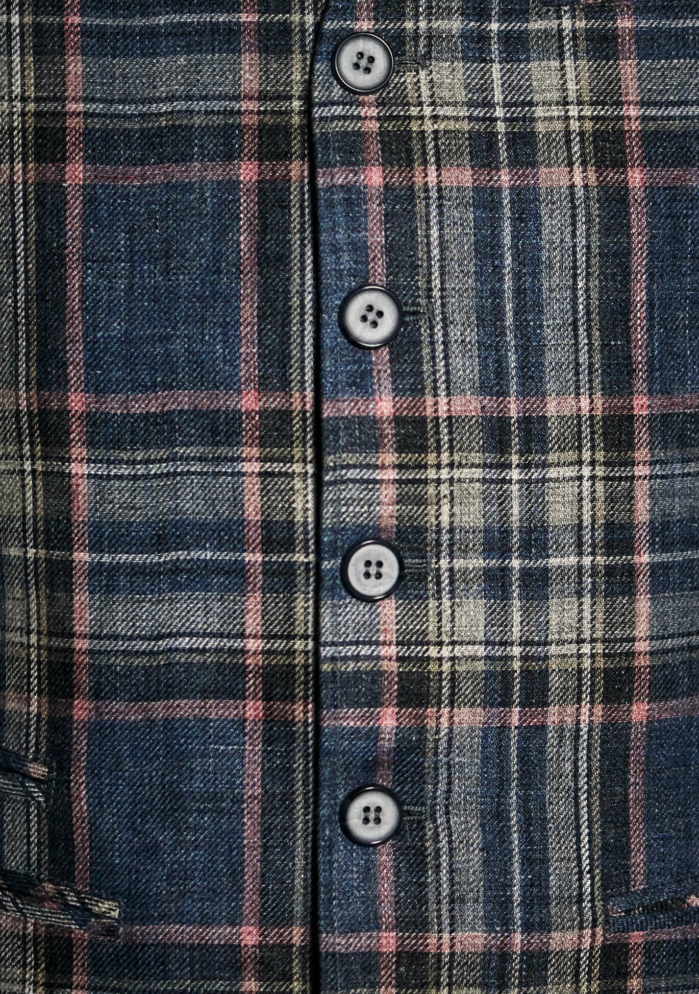Der Stehkragen, die dunklen Kontrastpartien und das ausdrucksstarke Karobild geben dieser Herrenweste eine markante, fast schon reiseinspirierte Präsenz. Besonders gut passt sie zu weißen, offwhitefarbenen oder hellblauen Oberteilen – von Hemden aus Baumwolle oder Leinen bis hin zu feinen Poloshirts oder leichten Longsleeves. Dazu harmonieren Chinos, gepflegte Denim oder sommerliche Stoffhosen in Beige, Sand, Taupe, Navy oder dunkleren Grautönen. Für einen lässigeren Auftritt lässt sich die Weste sehr stimmig mit offen getragenem Hemd, Polo oder schlichtem T-Shirt und cleanen Sneakern kombinieren. Etwas kultivierter wirkt sie mit hellem Hemd, ruhiger Hose und Loafern oder sommerlichen Lederschuhen. So entsteht ein Stil, der zwischen urbaner Souveränität, mediterraner Leichtigkeit und stilvoller Individualität seine besondere Wirkung entfaltet.