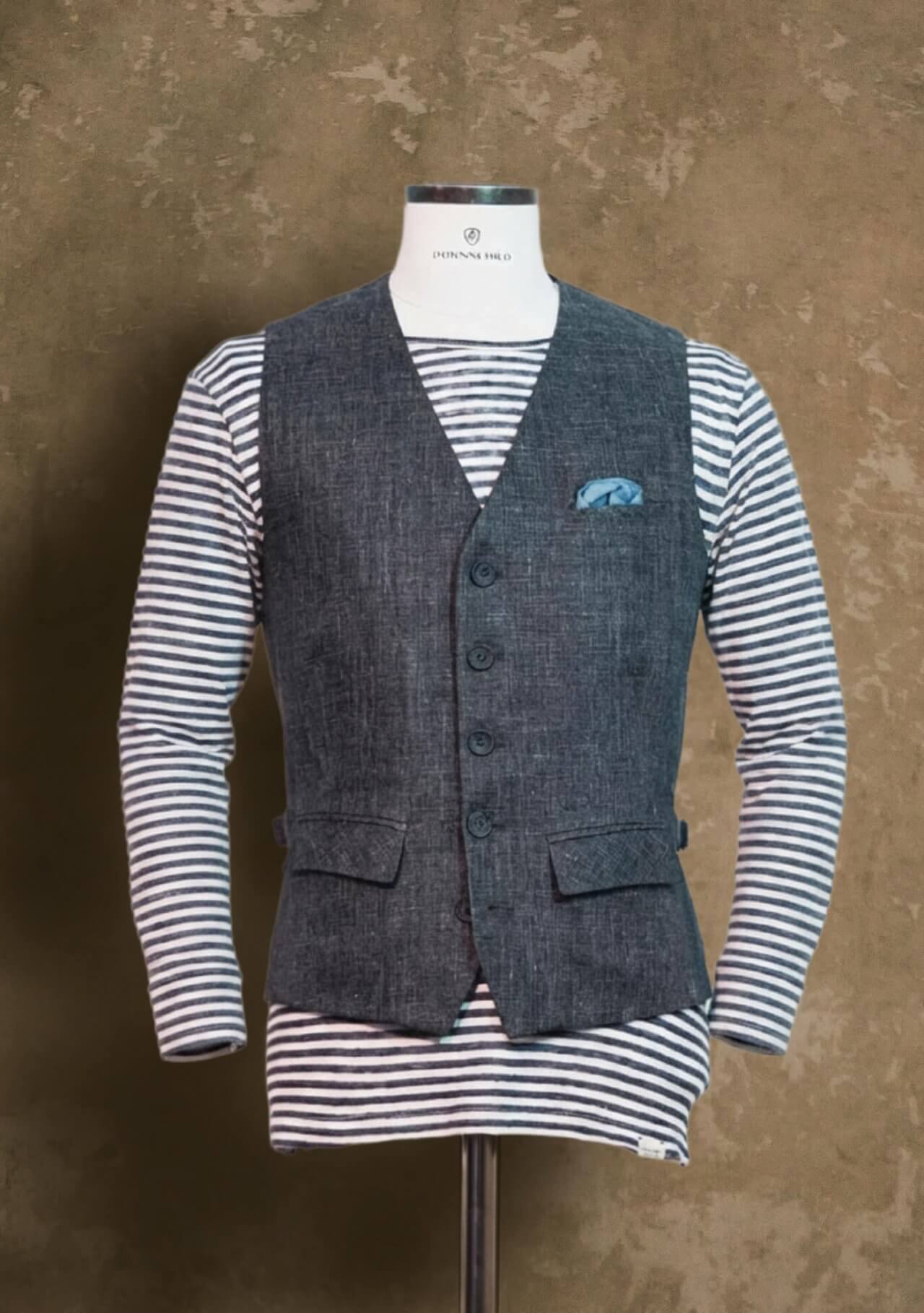 Das tiefe Denimblau und die fein melierte Leinenstruktur verleihen dieser Herrenweste (Gilet) eine moderne, urbane und vielseitige Ausstrahlung. Als leichte Leinenweste für den Sommer lässt sie sich besonders gut zu weißen, hellblauen oder mittelblauen Oberteilen kombinieren – von Hemden aus Leinen oder Baumwolle bis hin zu hochwertigen T-Shirts oder leichten Longsleeves. Auch ein gestreiftes Shirt bringt eine bewusst entspannte, maritime Note in den Look.