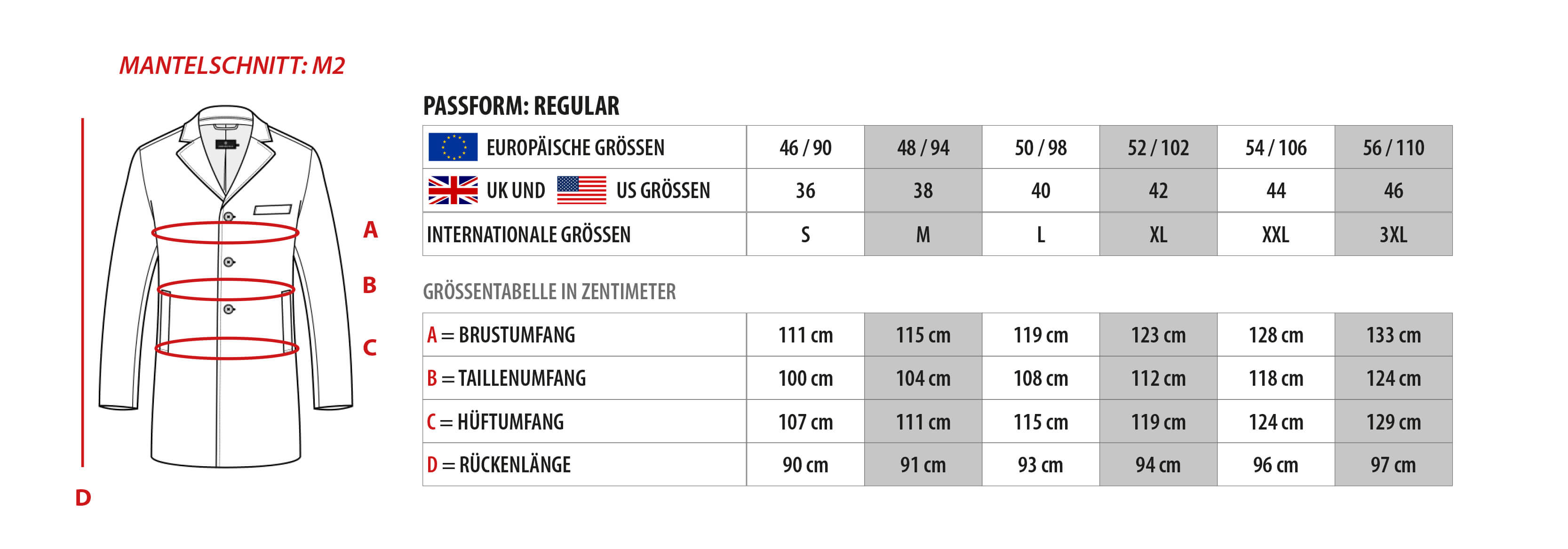 | Größe | 46/90/S, 48/94/M, 50/98/L, 52/102/XL, 54/106/XXL, 56/110/3XL |